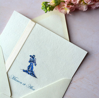 C’est un objet que l’on conserve, que l’on touche, que l’on remarque. Il installe l’identité visuelle de votre mariage et sert de fil conducteur à l’ensemble de la papeterie : menus, marque-places, livrets de vœux, livre d’or et album photo.